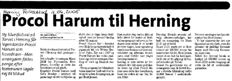 Jyske rock-arkæologer har gravet det legendariske band Procol Harum ud af den rytmiske musikhistories allerdybeste gemmer. Bandet, der udgav sin første single i 1963, er kaldt til Torvet i Herning for at optræde for byens bluesfestival den 13. august. Procol Harum har haft et kæmpe, gigantisk, legendarisk rock-hit: "A Whiter Shade of Pale". Det var i 1967.